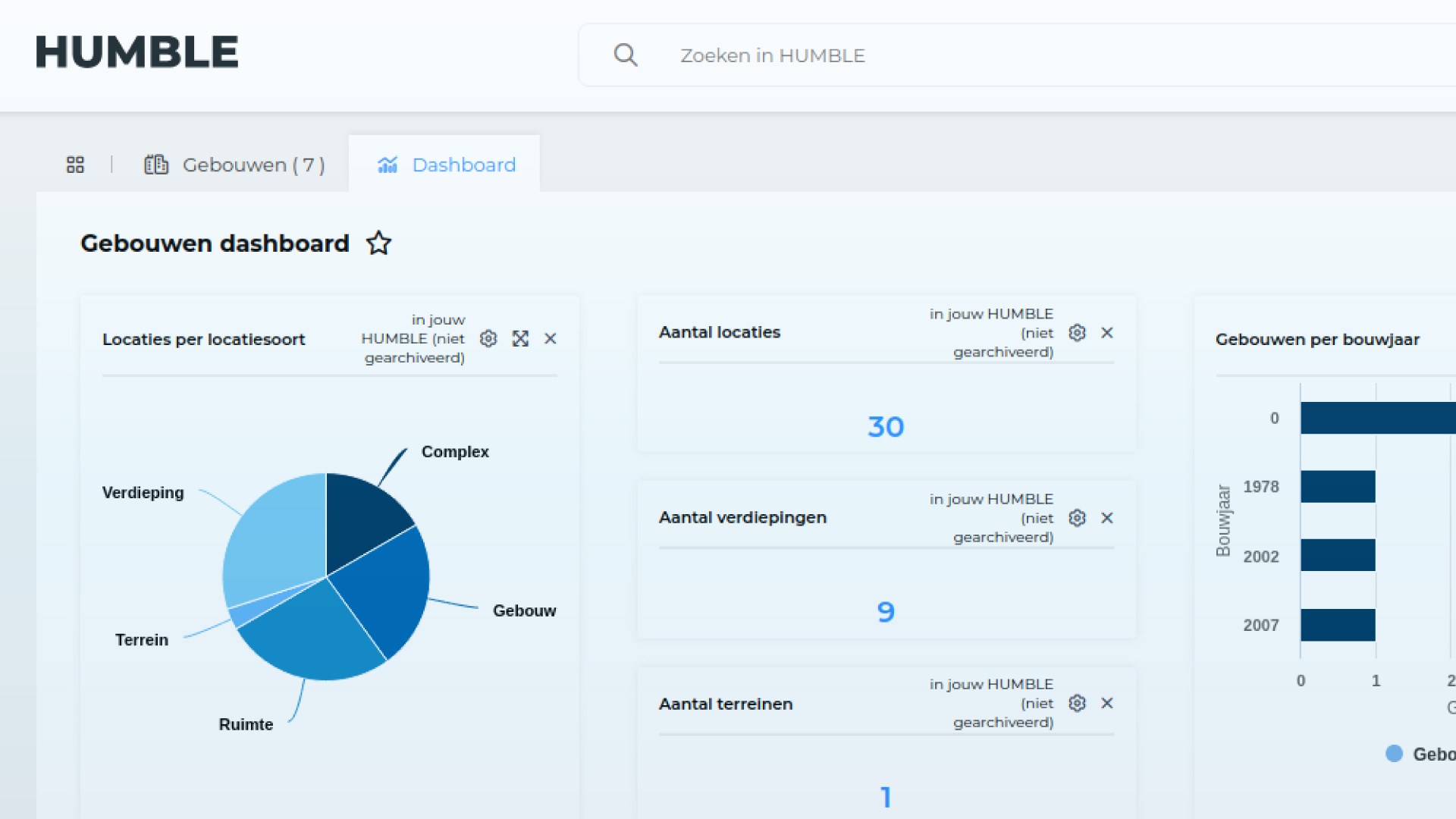Reken af met losse lijstjes en onoverzichtelijke spreadsheets. HUMBLE bundelt alle relevante gebouwinformatie in duidelijke dashboards en biedt slimme interfaces om je data te koppelen, verrijken en benutten. Wil jij ontdekken hoe wij jouw organisatie kunnen helpen om betere, datagedreven beslissingen te nemen? Probeer ons platform nu 30 dagen gratis.